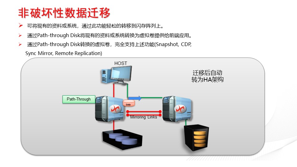 基于Pass-through功能,輕松實(shí)現(xiàn)了數(shù)據(jù)遷移,數(shù)據(jù)備份操作,降低了企業(yè)用于系統(tǒng)遷移總體投入成本,降低了操作復(fù)雜性,數(shù)據(jù)遷移備份可以短時間高效率完成,通過H-CLoud 存儲虛擬化網(wǎng)關(guān)成熟的技術(shù)安全進(jìn)行操作,遷移失敗會的恢復(fù)流程同樣簡單高效;