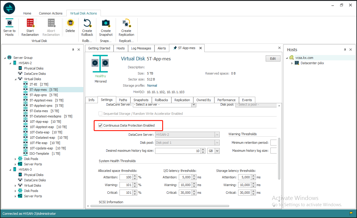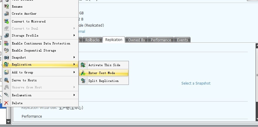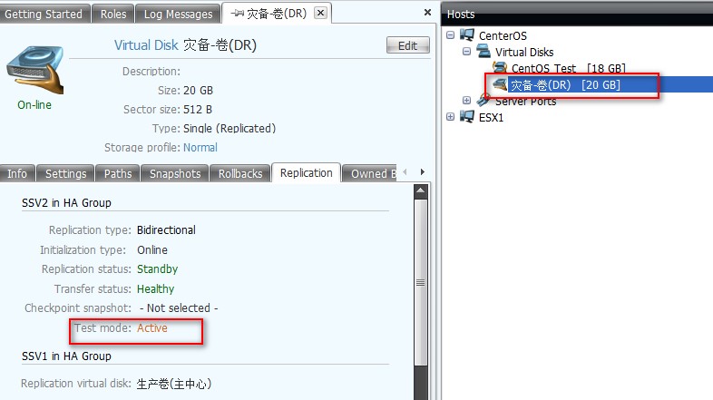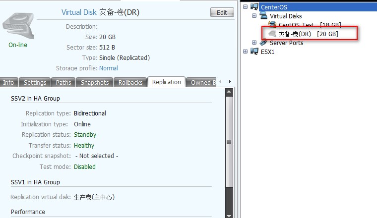 通過上圖可以看出,位于遠(yuǎn)程災(zāi)備中心的“災(zāi)備卷”在映射給主機(jī)之后被自動(dòng)鎖死,設(shè)置為灰色不可用訪問狀態(tài)。這和大多數(shù)產(chǎn)品一樣,為了避免與實(shí)時(shí)匯入新數(shù)據(jù)造成讀寫沖突。