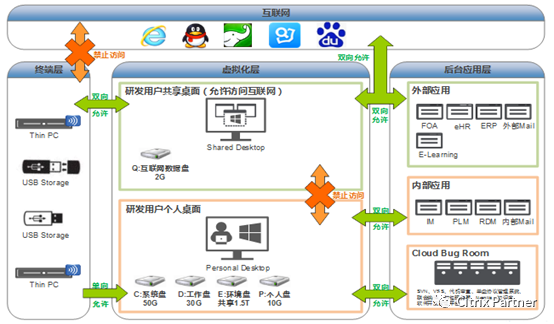 云桌面方案采用Citrix ADC和Citrix Virtual Apps andDesktops組件;圍繞研發(fā)數(shù)據(jù)安全展開,研發(fā)桌面云化,實現(xiàn)安全域的劃分,確保每個安全域的數(shù)據(jù)實現(xiàn)安全的出入;