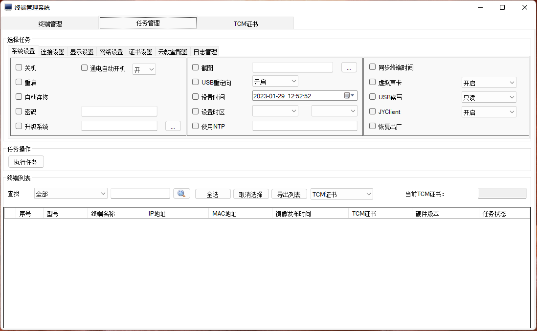 通過云終端管理系統(tǒng),勾選,關(guān)機,重啟等任務(wù)之后,在終端列表里選取需要操作的終端,點擊執(zhí)行任務(wù)即可后臺統(tǒng)一控制。