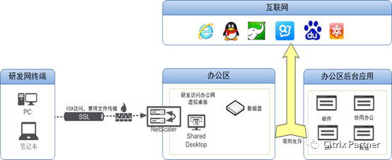 云桌面方案采用Citrix。研發(fā)(辦公)終端不能直接訪問(wèn)互聯(lián)網(wǎng),只通過(guò)虛擬桌面實(shí)現(xiàn)上網(wǎng);研發(fā)網(wǎng)終端只能訪問(wèn)NetScaler,通過(guò)NetScaler實(shí)現(xiàn)兩網(wǎng)之間的安全隔離,一般采用共享桌面/虛擬應(yīng)用來(lái)交付,實(shí)現(xiàn)白名單管理,IT管理員可以根據(jù)不同部門(mén)的安全需求,提供不同類(lèi)型的桌面和安全管理策略。