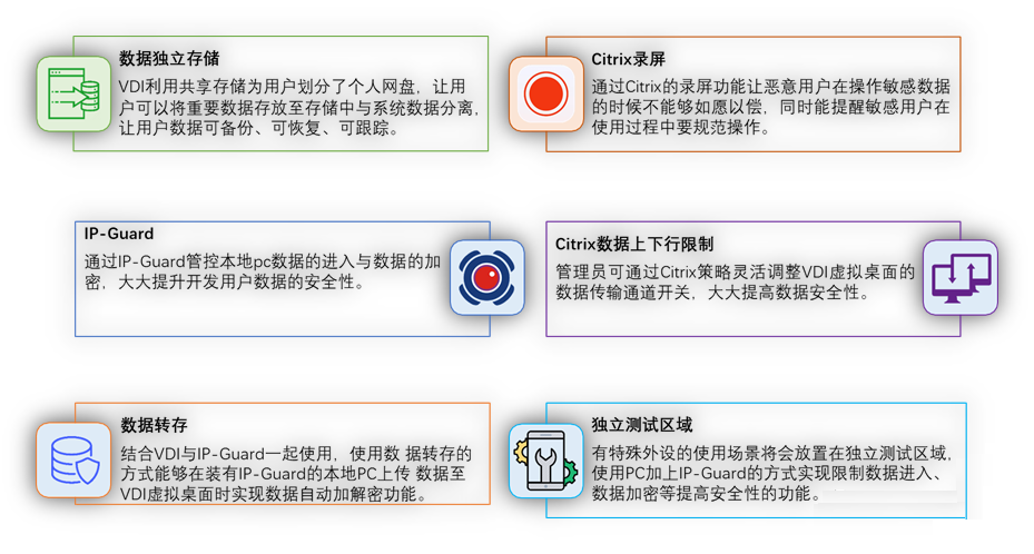 Citrix可以提供整體架構(gòu)安全加固設(shè)計(jì),從接入前,接入中,接入后多重維度來進(jìn)行安全保障,但是對于終端和云桌面數(shù)據(jù)交互部分是缺少更顆?;墓芸亍?/span>
