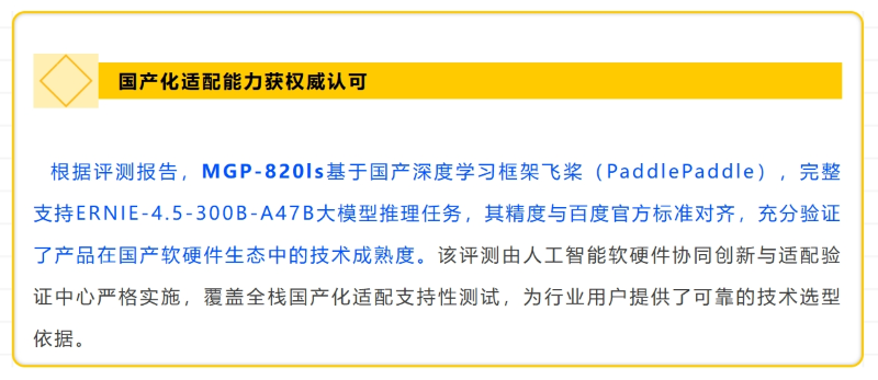 根據(jù)評(píng)測報(bào)告,MGP-820ls基于國產(chǎn)深度學(xué)習(xí)框架飛槳(PaddlePaddle),完整支持ERNIE-4.5-300B-A47B大模型推理任務(wù),其精度與百度官方標(biāo)準(zhǔn)對齊,充分驗(yàn)證了產(chǎn)品在國產(chǎn)軟硬件生態(tài)中的技術(shù)成熟度。該評(píng)測由人工智能軟硬件協(xié)同創(chuàng)新與適配驗(yàn)證中心嚴(yán)格實(shí)施,覆蓋全棧國產(chǎn)化適配支持性測試,為行業(yè)用戶提供了可靠的技術(shù)選型依據(jù)。