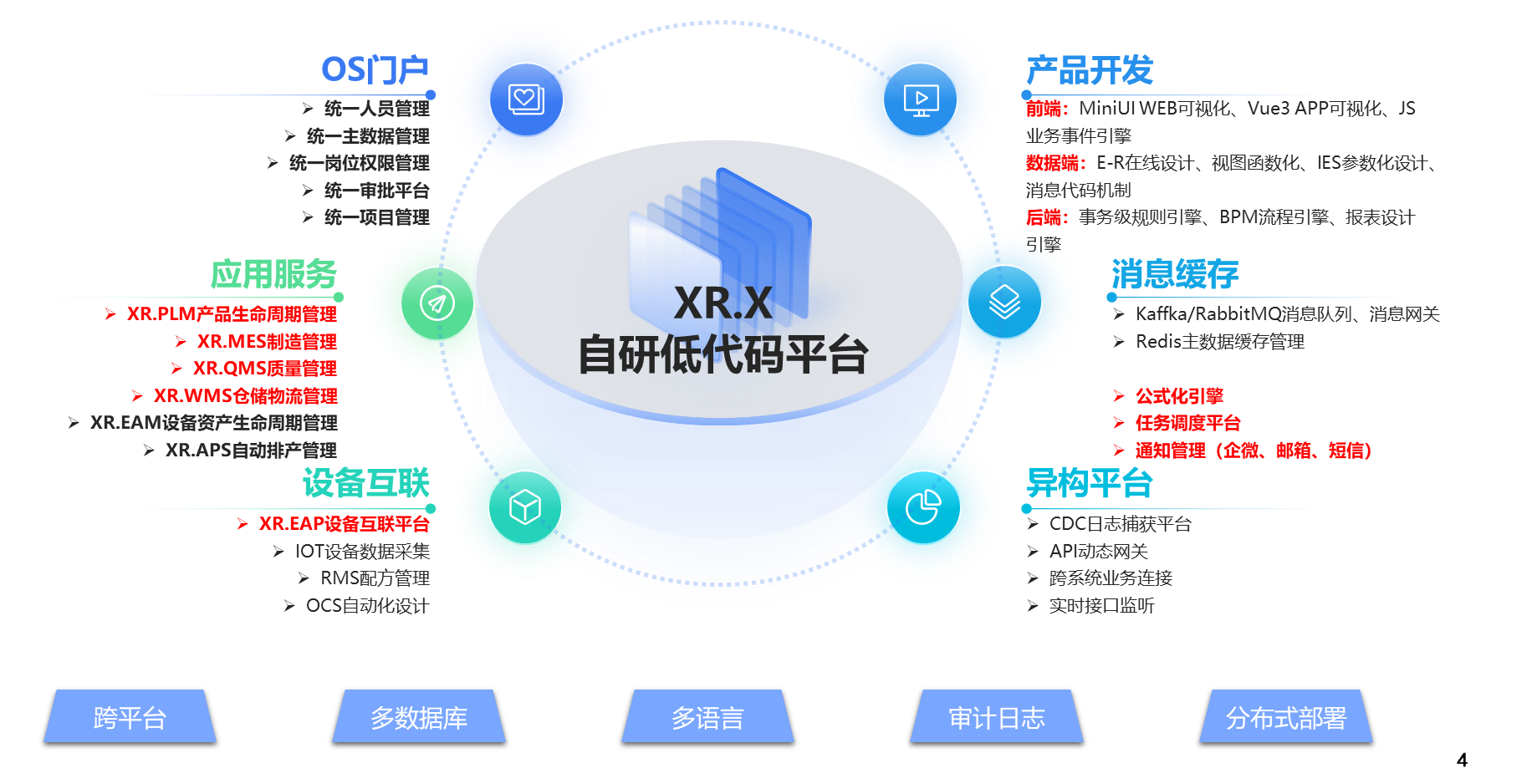 ?自研XR.X低代碼平臺(tái)是企業(yè)最佳智能制造流程的執(zhí)行平臺(tái),全面貫徹 “軟件定義制造” 的理念,以數(shù)據(jù)驅(qū)動(dòng)實(shí)現(xiàn)大規(guī)模個(gè)性化定制生產(chǎn)模式的落地。企業(yè)可通過(guò)XR.X平臺(tái)的核心產(chǎn)品構(gòu)建“可追溯性、智訊化、場(chǎng)景化的數(shù)字化整體解決方案”。曉軟 XR-X 平臺(tái)產(chǎn)品秉承穩(wěn)定、彈性、高效、開(kāi)放、易維護(hù)設(shè)計(jì)核心理念,集成微服務(wù)化彈性系統(tǒng)架構(gòu)、開(kāi)放且一致性開(kāi)發(fā)平臺(tái)、通用接口系統(tǒng)輕松整合、類(lèi)低代碼二次開(kāi)發(fā)環(huán)境、積木式的核心系統(tǒng)框架、開(kāi)箱即用營(yíng)運(yùn)管理平臺(tái)6大核心優(yōu)勢(shì)。