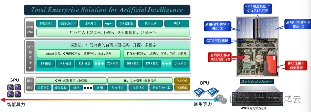 諾亞鴻云致力于構(gòu)建一套整體的人工智能基礎(chǔ)建設(shè)方案 ,CPU通算 + GPU智算一體機(jī)、通過先進(jìn)的混合算力體系。